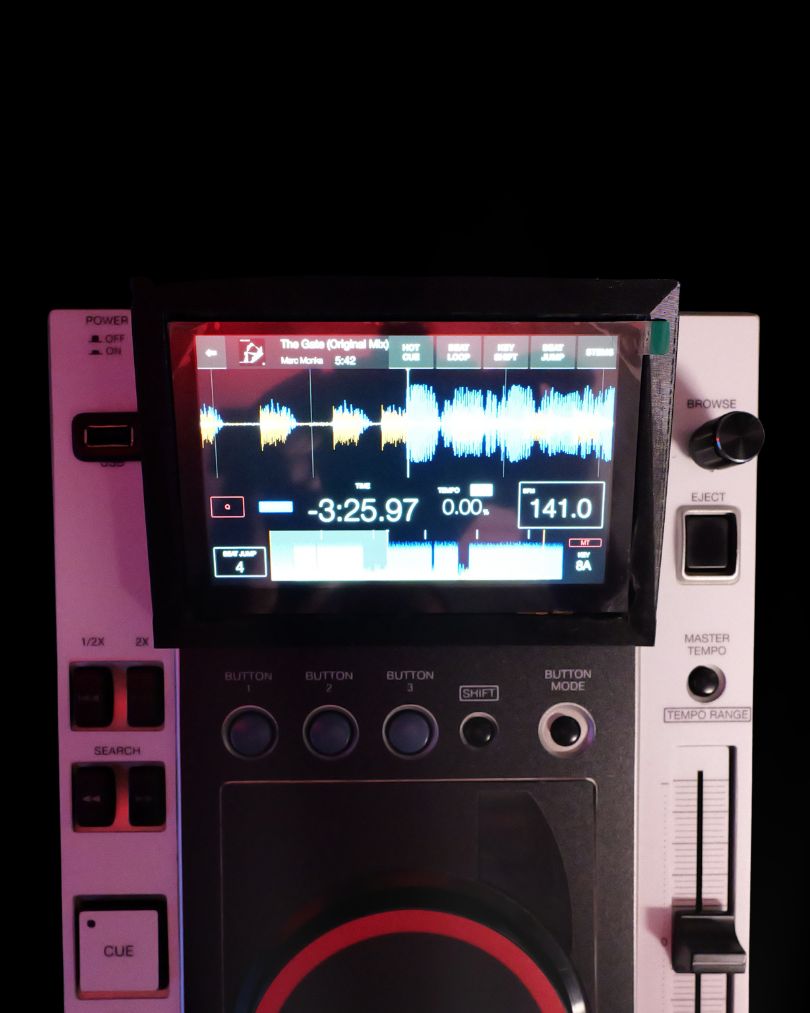Everything is build inside the original CDJ-100S case, keeping its iconic look. The 5 inches touchscreen is mounted in a custom 3D-printed case and a printed adhesive skin features the new button layout.